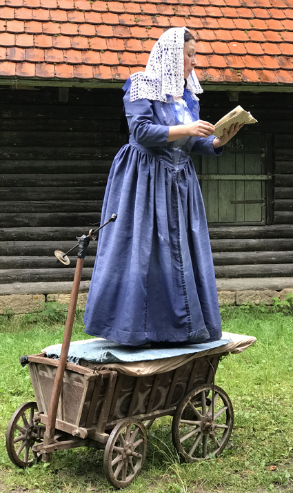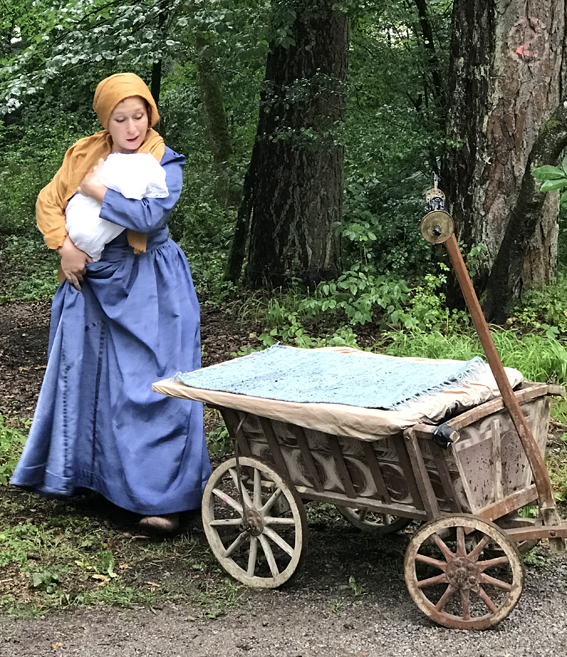 Auf dem Weg zur Dünnbach-Hütte vergaß man die Regenschauer, zumal Nässe und Matsch die Unbill des Lebens einer fahrenden Schauspielerin perfekt in Szene setzten. In szenischen Miniaturen verdeutlichte Janne Wagler Lebensstationen der Komödiantin, tiefere Einblicke gaben kurze Lesungen aus dem Buch „Nichts als eine Komödiantin“ von Petra Oelker.