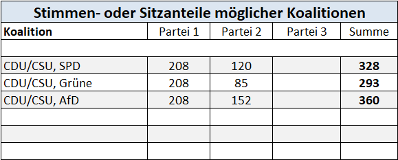Wolfgang Hesse erläutert zunächst, wie aus den Stimmanteilen einer Partei bei der Bundestagswahl die Zahl ihrer Sitze im Parlament errechnet wird. Da es nur eine mögliche Koalitionsoption (CDU/CSU mit SPD) gibt, werden auch nur deren Sitzanteile gezeigt. Zum Abschluss wird diese Koalition nach vier Faktoren (politisch, psychologisch) von Professor Brettschneider, Universität Hohenheim, bewertet. Danach scheint eine Koalition dieser beiden Parteien realistisch.