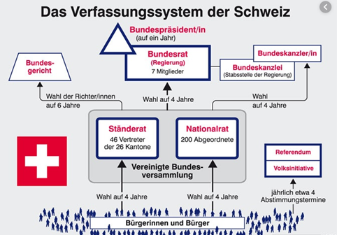 - In der Schweiz werden Themen diskutiert, die in Deutschland meist noch tabu sind, z. B. Sterbehilfe, Art der Krankenversicherung (es gibt nur eine private Pflichtversicherung mit nicht geringen Kosten), Verhältnis zwischen Eigenverantwortung und Verantwortung des Staates bzw. der Gemeinde.