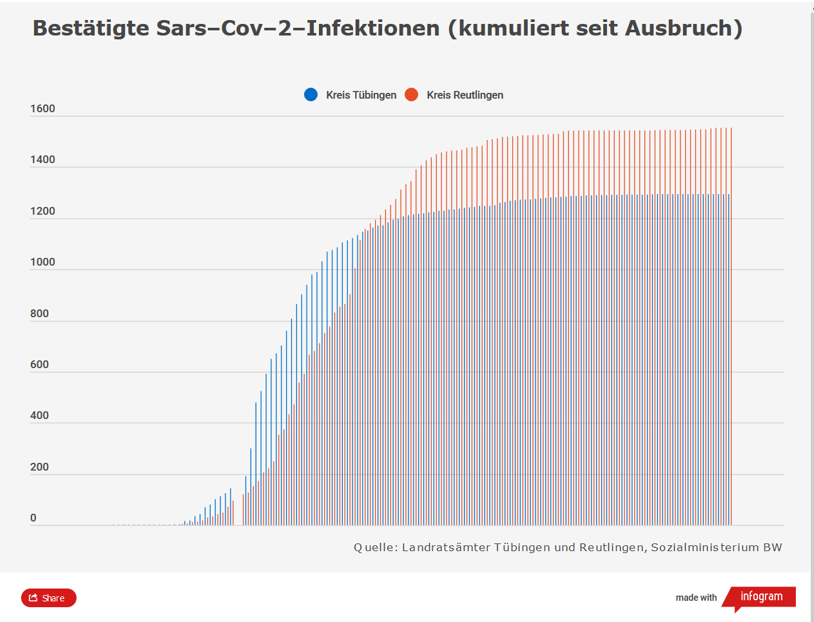 Es zeigt die Anzahl der bestätigten Infektionen (kumuliert seit Beginn des Ausbruchs) in den Landkreisen Reutlingen und Tübingen. Grundlage sind die täglich veröffentlichten Zahlen der Gesundheitsämter Tübingen und Reutlingen, die jeweils zum Abend veröffentlicht wurden.