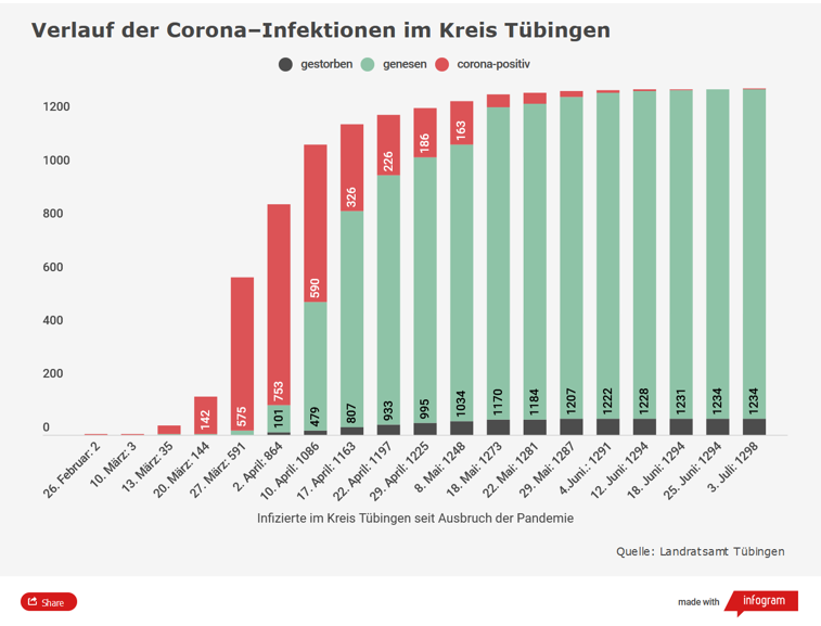 Am 26. Februar 2020 wurden im Kreis Tübingen die ersten beiden Corona-Fälle offiziell registriert, bei einem Oberarzt der Pathologie und seiner Tochter, die aus Italien zurückgekommen waren. In den ersten beiden Märzwochen lagen die Fall-Zahlen überschaubar im Zehnerbereich. Seit dem ersten Fall veröffentlichte das Schwäbische Tagblatt täglich einen Live-Blog online, der oft schon morgens um 6 Uhr die ersten Nachrichten online stellte und abends um 11 die letzten Meldungen zum Tag brachten. Dieser Live-Blog erreichte ausgesprochen hohe Abrufzahlen. Fester Bestandteil des Live-Tickers wurde dieses täglich aktualisierte Diagramm: