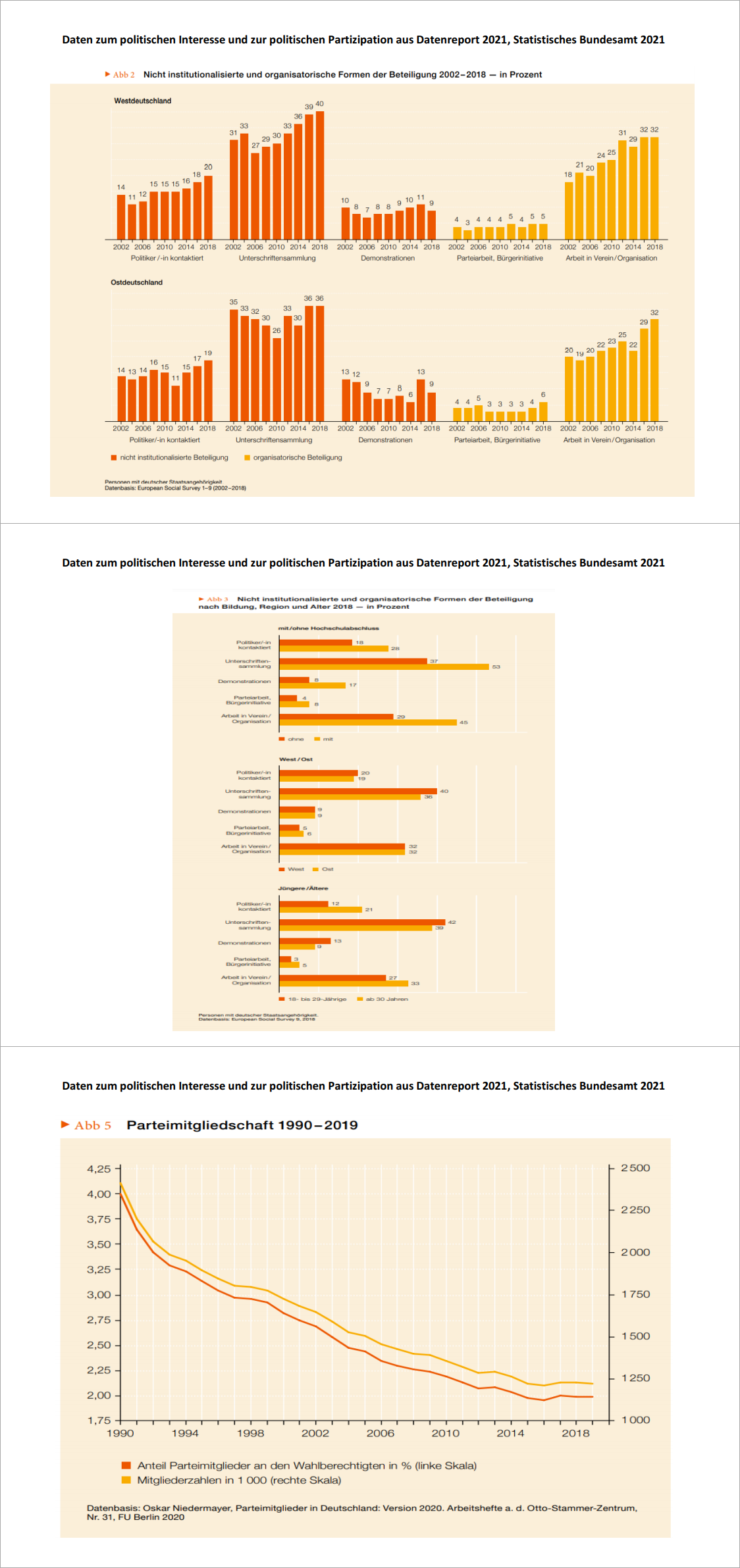 Als Bindeglied zwischen beiden Veranstaltungen und als ergänzende Datengrundlage für unser heutiges Thema, möchte ich drei Folien mit aktuellen Untersuchungsergebnissen zur politischen Partizipation der Bürger in Deutschland zeigen. Diese Folien sind dem aktuellen Datenreport 2021 der Bundeszentrale für politische Bildung entnommen.