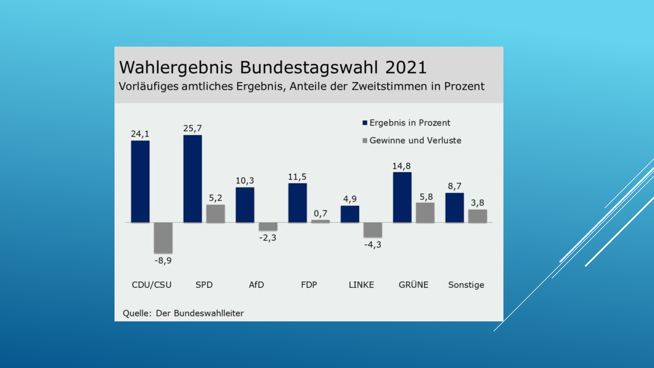 CDU/CSU fahren bei dieser Wahl mit nur noch 24,1% ihr historisch schlechtestes Ergebnis ein. Die SPD, bei der Wahl 2017 auf einem historischen Tief von 20 %, kann sich um ca. 5% auf 25,7% verbessern und wird so als schwächster Wahlsieger bei Bundestagswahlen zur stärksten Partei. Die Grünen können sich von 8,9% auf 14,8% verbessern, die FDP bleibt relativ stabil bei knapp 12%. Die AfD mit 10,3% (-2,3%) und Die Linke mit 4,9% (-4,3%) verlieren Teile ihrer Wählerschaft. Die Linke kann aufgrund einer Sonderregelung dennoch ihren Verbleib im Bundestag sichern, da sie in den ostdeutschen Bundesländern mindestens drei Direktmandate erzielte.