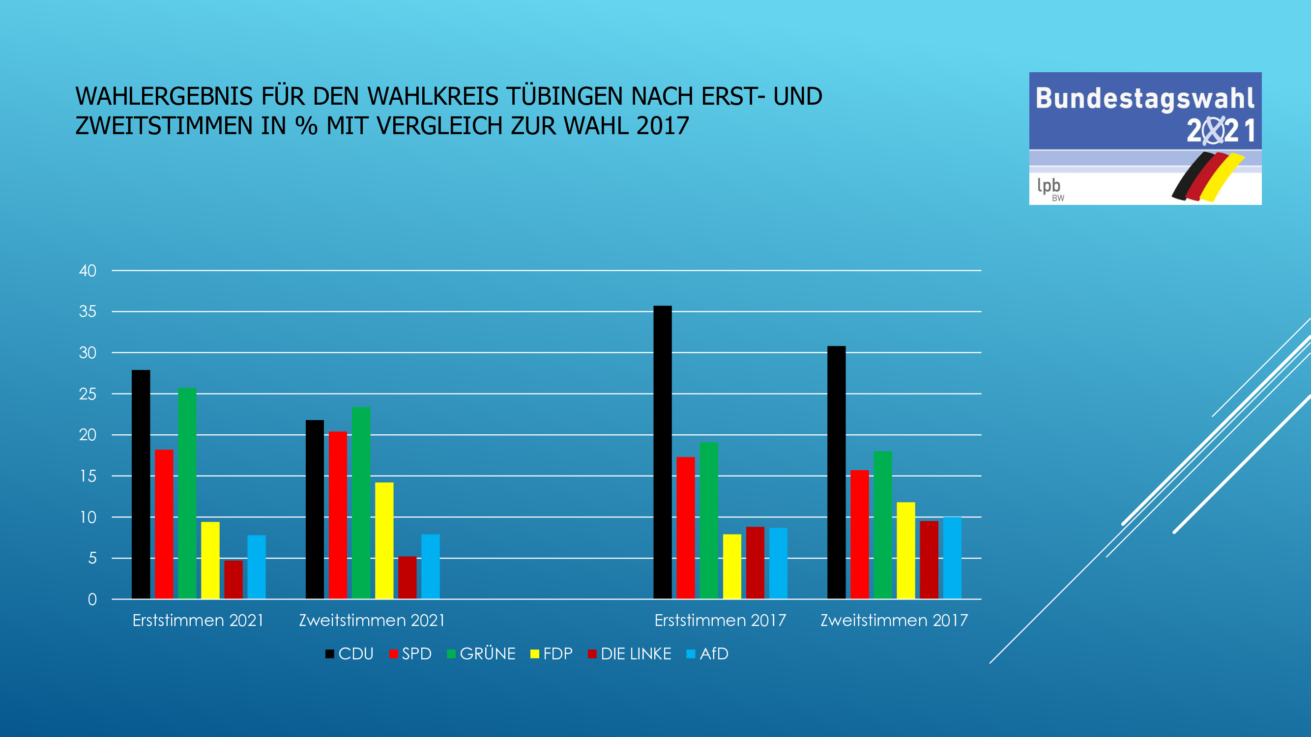 Ähnlich wie im Bund gibt es auch im Wahlkreis hohe Verluste für die CDU, sowohl bei den Erststimmen und noch stärker bei den Zweitstimmen. Die Kandidatin der CDU, Annette Widmann-Mauz, hat es ihrem über Jahre gezeigten Einsatz für den Wahlkreis zu verdanken, dass sie dieses Mal erneut das Direktmandat mit 27,9% der Erststimmen erringen konnte, knapp vor Chris Kühn von den Grünen mit 25,7%. Dagegen landeten die Grünen bei den Zweitstimmen mit 23,4% erstmals auf Platz eins gegenüber der CDU mit nur noch 21,8% (- 9%). Die SPD konnte ebenfalls zulegen und erreichte bei den Zweitstimmen 20,4% (+ 5%). Die FDP liegt bei den Zweitstimmen mit 14,2% erheblich über dem Bundesdurchschnitt, wobei die Differenz zu den Erststimmen mit 9,4%, also 5 % weniger, auffällt. Die Linke verliert im Wahlkreis sowohl bei Erst- und Zweitstimmen fast die Hälfte ihrer Wähler, die Wahlkreiskandidatin Heike Hänsel verpasste den Einzug in den Bundestag. Die AfD verliert bei den Erststimmen nur 1%, bei den Zweitstimmen 2%, erreicht noch 7,9% und liegt somit unter dem Bundesdurchschnitt. Im Wahlbericht des Schwäbischen Tagblatts wird festgestellt, dass der Wahlkreis wie kaum zuvor gespalten ist zwischen ländlichen und städtischen Regionen, wobei in den meisten ländlich geprägten Kommunen die CDU zum Teil dramatische Stimmeneinbußen von bis zu -10% zu verzeichnen hat.
