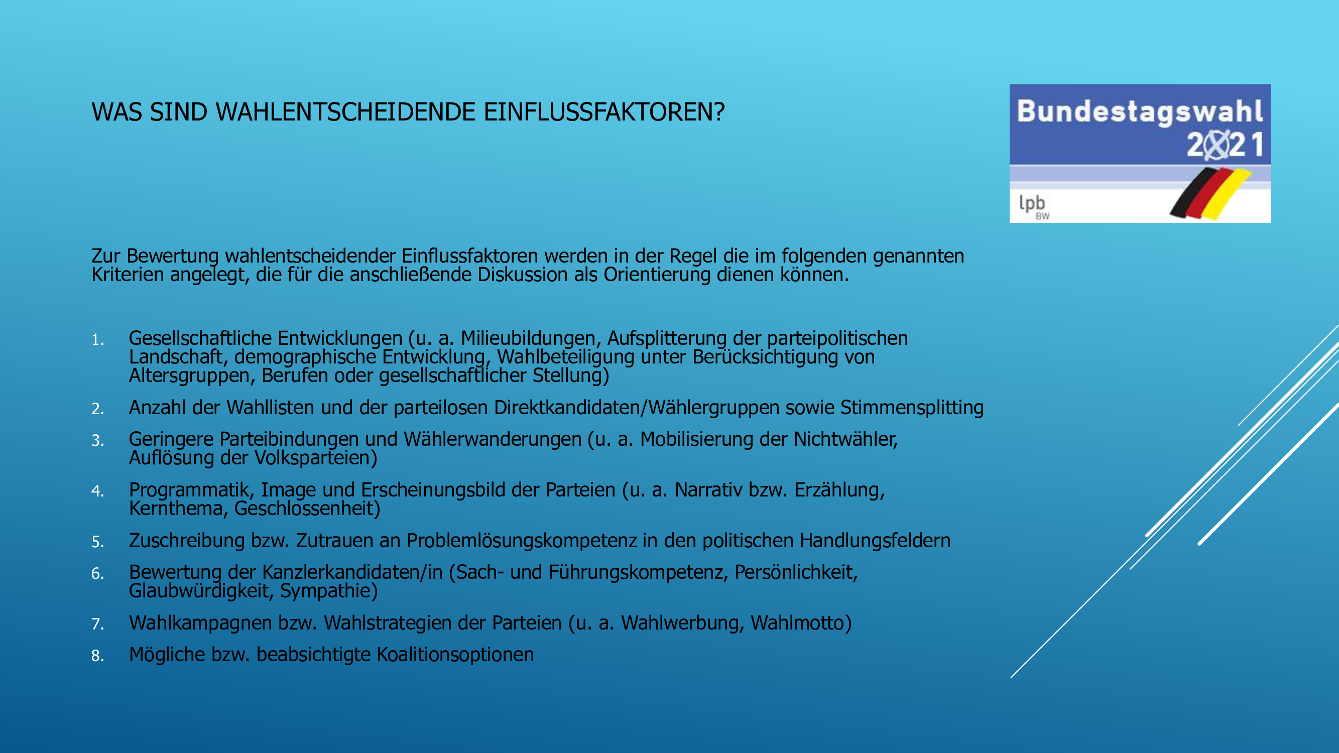 In Verbindung mit den zuvor durchgeführten Umfragen wird in der Analyse des Wahlergebnisses deutlich, welche Einflussfaktoren in der Regel wahlentscheidend sind. Für die anschließende Diskussion sind diese nochmals zusammengefasst: