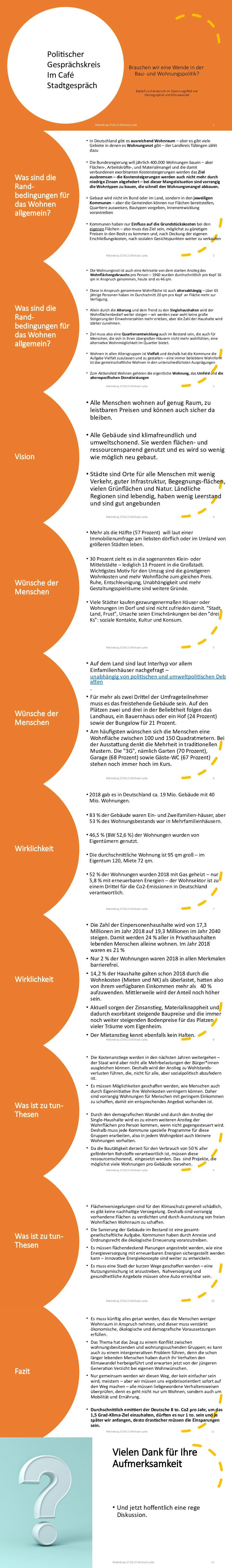 Ist es angesichts solcher Rahmenbedingungen überhaupt noch realistisch, wie politisch gewollt, das geplante Soll an Wohnraum zu erreichen bzw. kostengünstigeren Wohnraum zu schaffen? Wie können wir als Gesellschaft, als Kommune, aber auch als Bürger diesen widerstreitenden Zielen gerecht werden? Gibt es Perspektiven und Wege, dennoch verträgliche Lösungen zu finden? Darüber wollen wir heute miteinander ins Gesprächs kommen und dabei auch die konkrete Situation in Rottenburg in Blick nehmen.