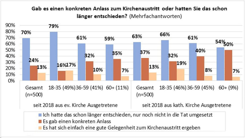 Das Sozialwissenschaftliche Institut der EKD (SI) hat in einer bundesweiten Befragung Wege und Anlässe für Kirchenaustritte seit 2018 untersucht. Lediglich eine Minderheit benennt einen konkreten Anlass für den Kirchenaustritt (24 % vormals Evangelische, 37 % vormals Katholische). Dabei zeigt sich ein deutlicher Zusammenhang zum Alter: Jüngere Befragte nennen konkrete Anlässe seltener als Ältere, und sie geben häufiger an, sich für diesen Schritt schon länger entschieden zu haben, fast ein Fünftel unter ihnen nutzt eine sich ergebende „gute Gelegenheit“. Das zeigt: Man kann nicht einfach die Austrittswelle auf die Missbrauchsfälle oder die goldene Badewanne von Tebartz-van Elst allein schieben.