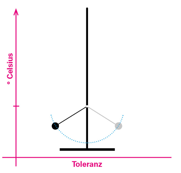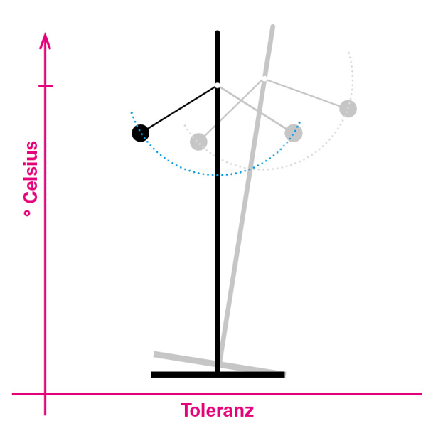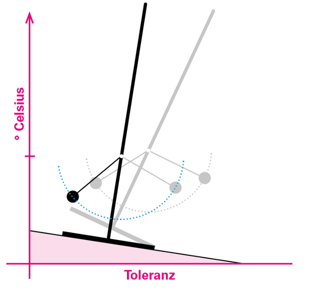 Abbildung 2b: Mit der Erderwärmung (höherer Aufhängungspunkt des Pendels) wird ein Kipppunkt erreicht, Toleranz und mit ihr die Resilienz des Systems gehen auch deshalb verloren, weil der Pendelfuß die Bodenhaftung (Resistenz) verliert, also keinen Rückhalt mehr von der Basis hat, sich nicht mehr „verständlich“ machen kann.