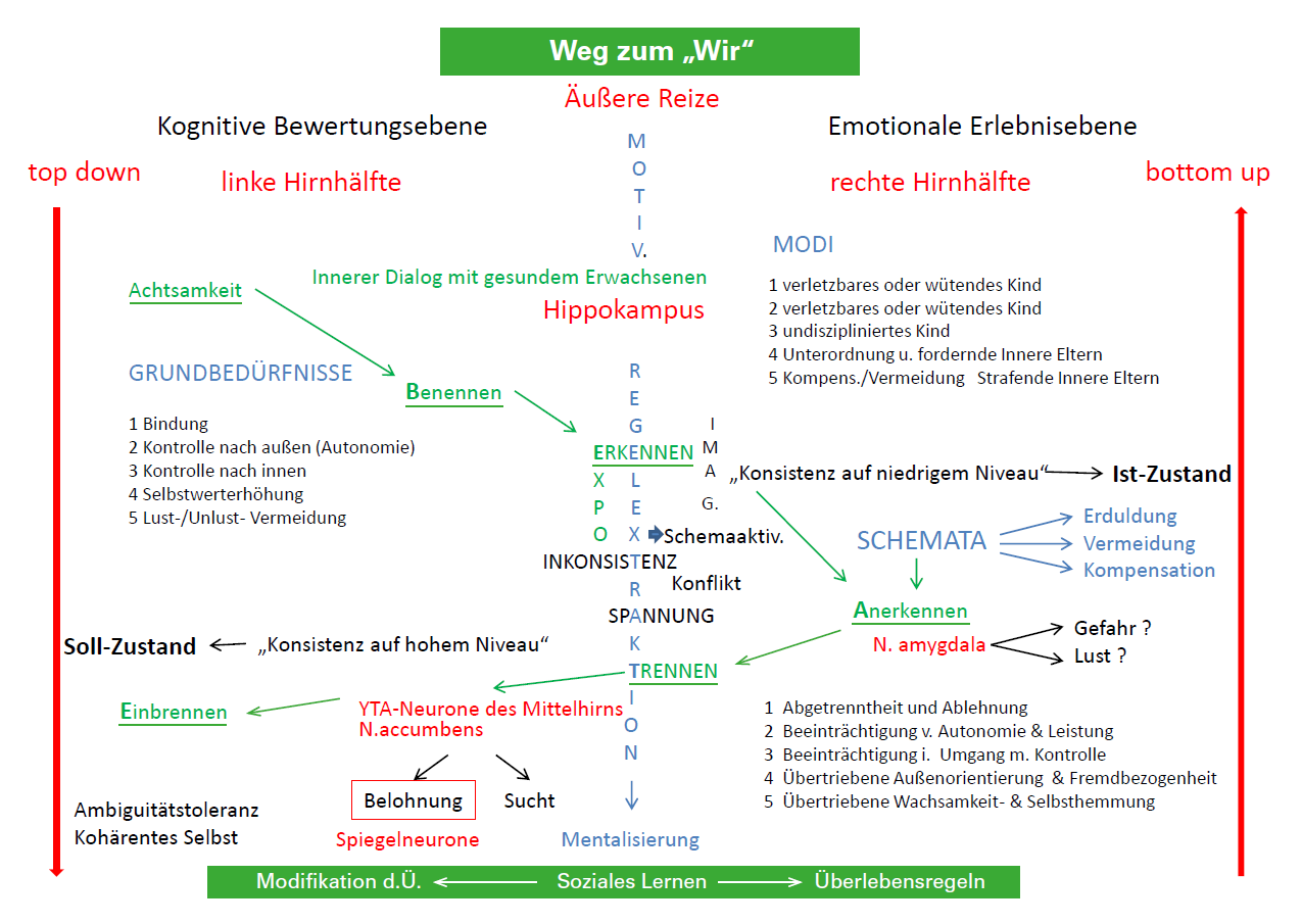 [17] Abbildung 3 zu These 10 „Weg zum „Wir““ in Pdf-Datei als Anlage vorhanden: Aus älteren Hirnregionen steigen Gefühle in den rechten Neokortex auf („bottom up“) und erinnern über Schema-Modi an zurückliegende Erfahrungen, indem sie über den Hippokampus zur linken Hirnhälfte überspielt und an Grundbedürfnissen überprüft, verbalisierbar und über einen „inneren Dialog“ modifizierbar werden (Sprachzentrum bei Rechtshändern ist linkshirnig angelegt). Dies gelingt nur, wenn keine Angst im Spiel ist und nicht Reflexe auf niederer Hirnebene (N. amygdale) eingeschaltet sind. Erst auf bewußter Ebene können („top down“, willentlich) alte Verhaltensmuster modifiziert und Soziales Lernen belohnt (N. accumbens) werden. Damit wird Ambiguitätstoleranz und ein kohärentes Selbst verbessert.