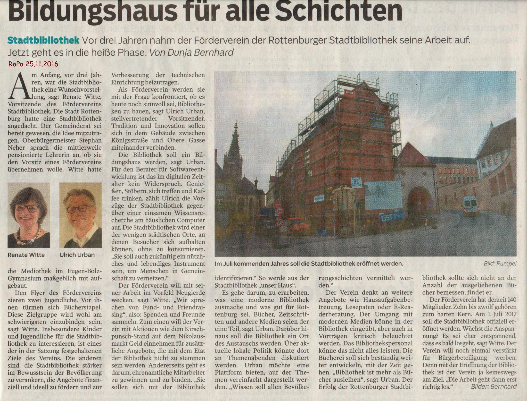 Einen Herzenswunsch aller Bibliothekbenutzer - erweiterte Öffnungszeiten morgens, abends und am Wochenende - wäre ein Betätigungsfeld für den Förderverein, bei dem das Team der Stadtbibliothek kolossal entlastet werden könnte. Das Konzept der „open library“, das in vielen Bibliotheken praktiziert wird, wünschen wir uns auch für Rottenburg. Hier könnte die Bibliothek länger geöffnet bleiben und Ehrenamtliche könnten bei der Aufsicht unterstützen.